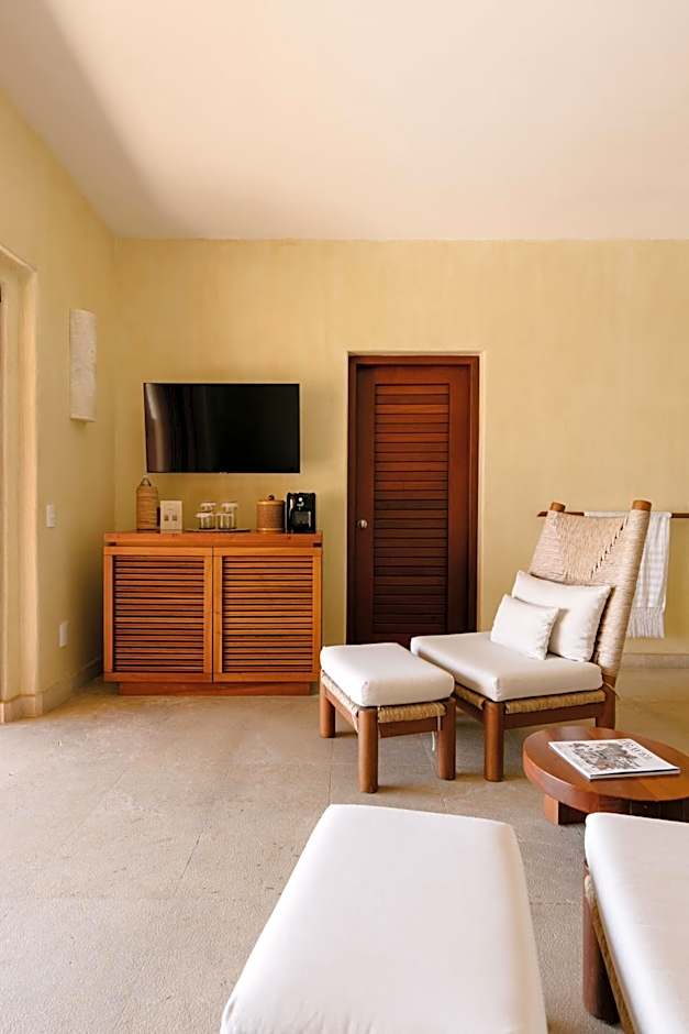 Overlooking the ocean, this impressive suite features a terrace with a Palapa-style thatched roof and an infinity plunge pool. This room features a king size bed. There is a king-size bedroom, and a seating area with satellite TV.